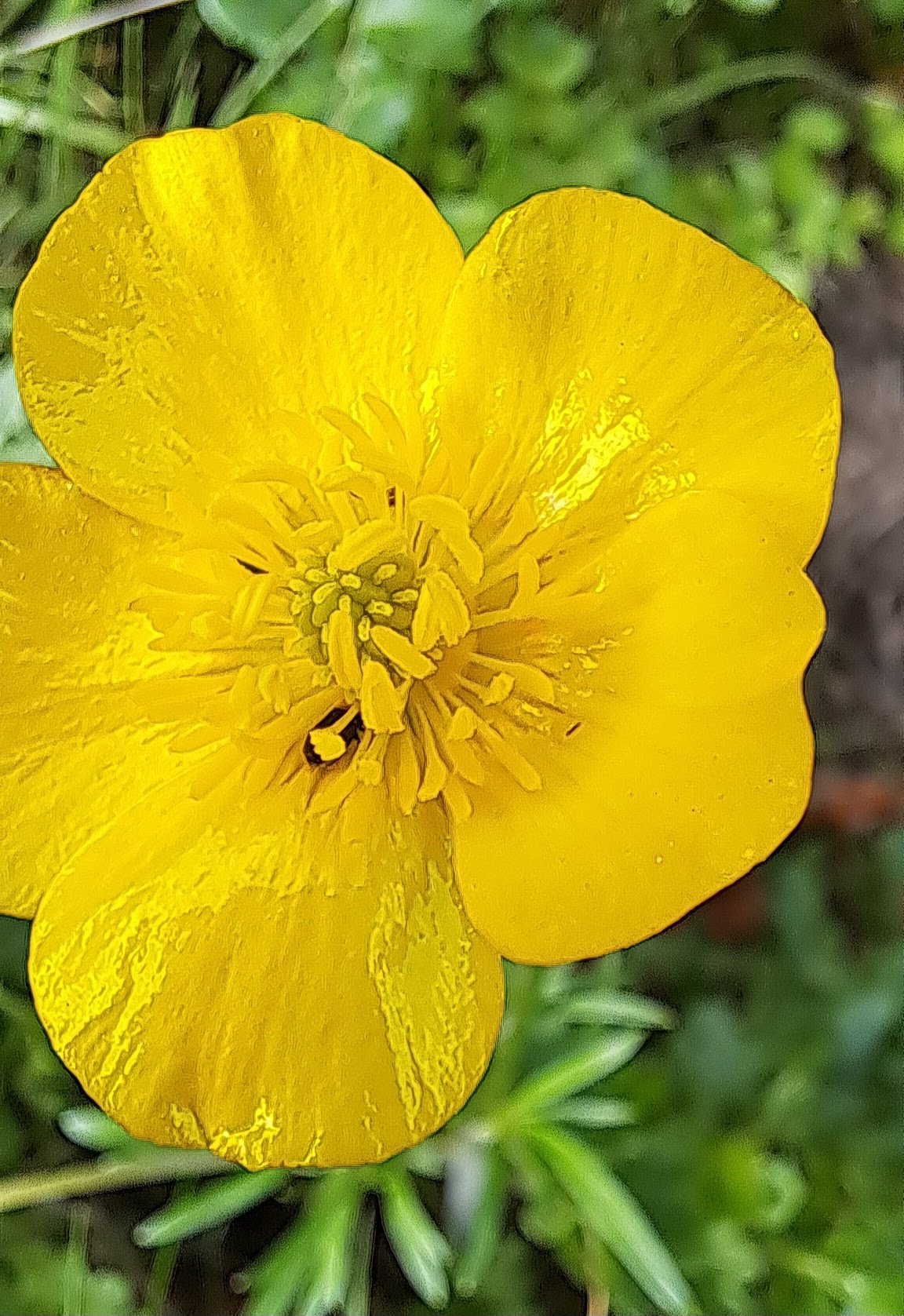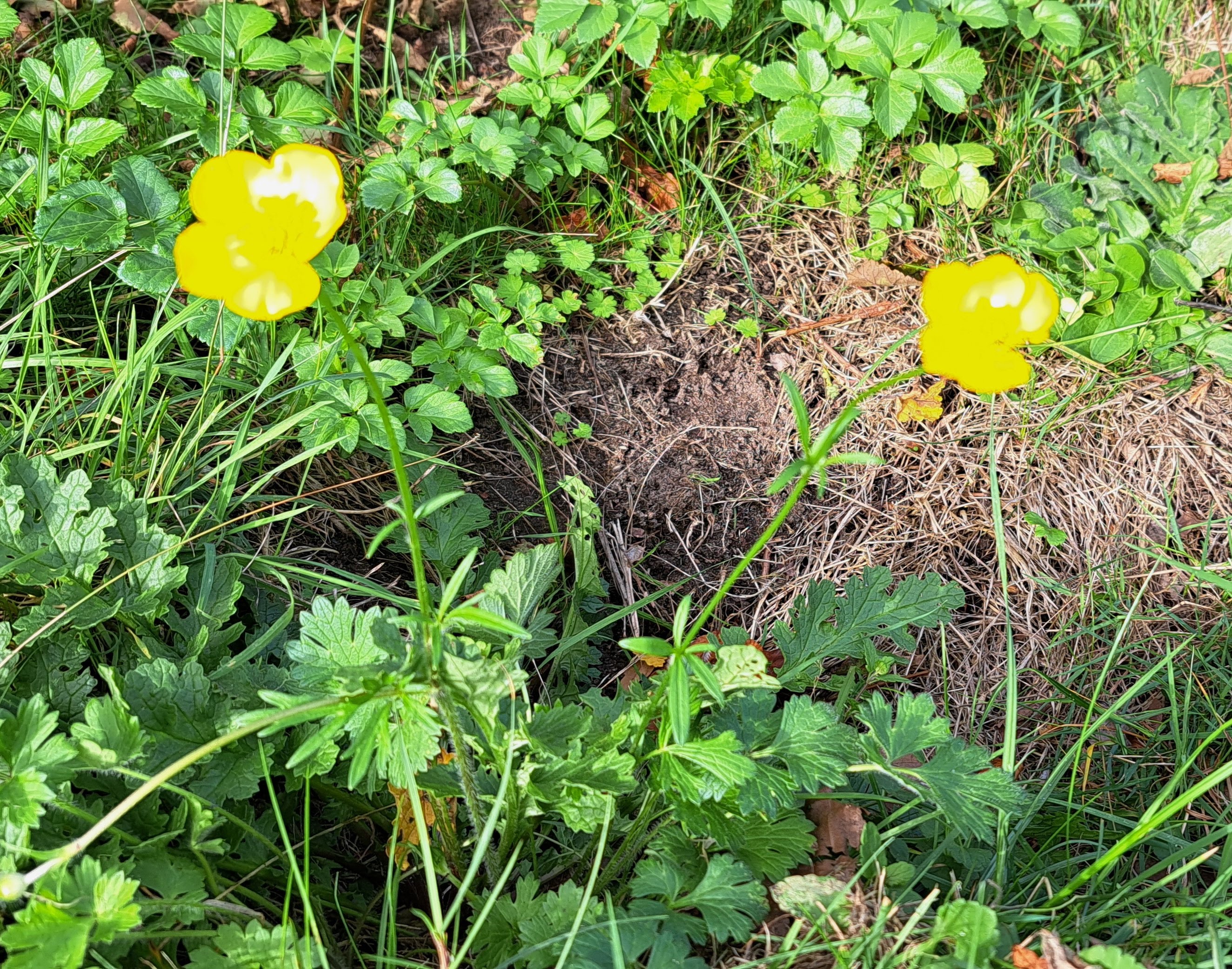 Latest: 23/10/2025: We are still tackling the strimming, raking, and rough mowing in the South west corner. We've 'uncovered' some wonderful 1930s art deco stones which I'll share another time (when Storm Benjamin has passed!). We met for over an hour with Cathy Smith, Suffolk Wildlife Trust's Churchyard and Green Spaces Officer, looking at the wildflowers already present here. 27 species were immediately identified, including this Bulbous Buttercup, which shouldn't be in flower at the end of October! We also talked much about grass management of course.