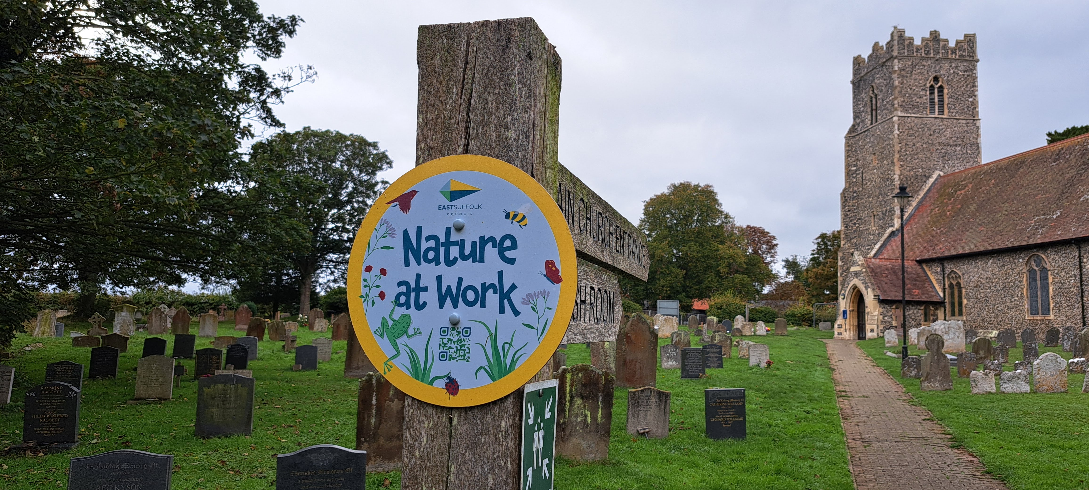 East Sufffolk Council actually found us first! But we quickly acted to work together to promote 'Nature at Work' within the Churchyard. You will find at least three of these signs around the churchyard. Two are in general notice on our signboards whilst the other is against a small area in the north of the churchyard that is being managed by our neighbours in an informal engagement between the church and the community.